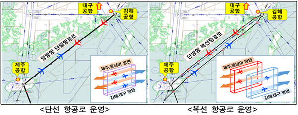 국토부는 항공로 복선화를 통해 제주 방향과 부산 방향이 분리 운영돼 항공기 상승과 하강 중에 발생할 수 있는 항공기 간 근접 가능성을 차단해 항행안전성을 높이고 원활한 항공교통 흐름으로 정시성도 향상할 수 있을 것으로 기대하고 있다.
