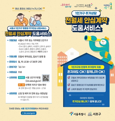 먼저 구는 '서초구 1인가구 전·월세 안심계약 도움서비스'를 이달부터 본격 운영 중이다. 사회 초년생, 생애 첫 계약 등 경험과 정보가 부족해 상대적으로 부동산 계약에 취약한 1인 가구의 안정적인 정착을 돕기 위해서다.