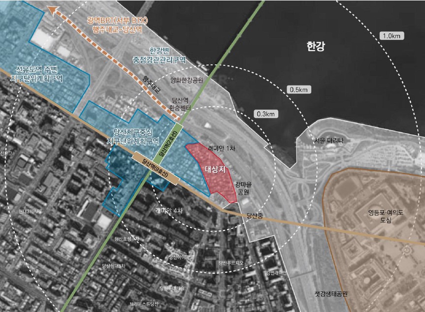 대상지는 2호선·9호선 당산역과 가깝고 한강을 걸어서 이동할 수 있다는 우수한 입지 여건을 갖췄지만, 가늘고 긴 대지 형태와 주변 단지로 가로막힌 한강 조망 등 건축 배치에 한계가 있었다. 서울시는 이 같은 불리한 대지 여건을 극복하면서도 한강변의 입지적 강점을 살린 기획안을 마련, 주민들의 공감을 이끌어냈다.