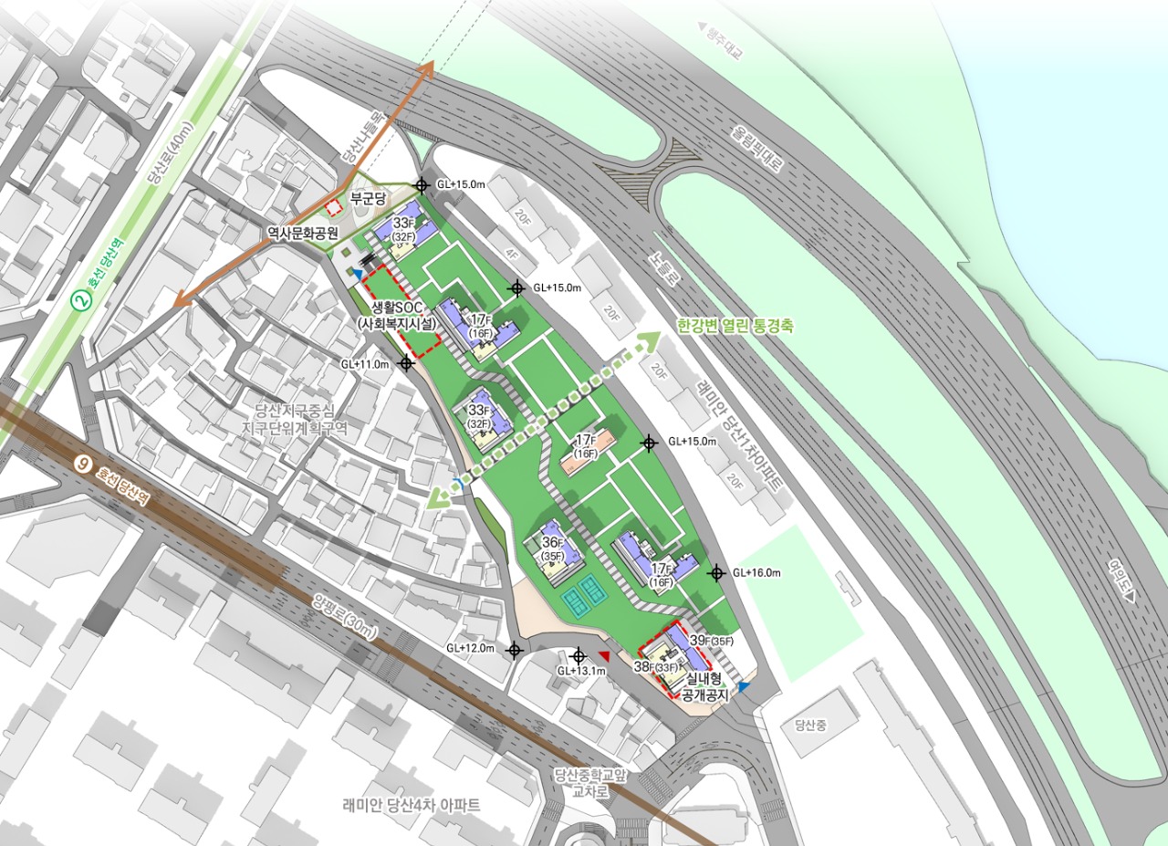 이번에 확정된 당산동6가 104일대 신속통합기획안에 따르면, 이 일대는 한강변 상징적 경관을 형성하는 새로운 주거단지(30,973㎡, 39층, 약 780세대 규모)로 거듭난다.