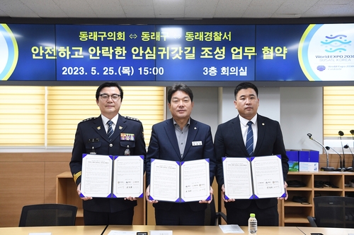 부산 동래구는 지난 25일 동래구청 회의실에서 동래구의회 및 동래경찰서와 '안전하고 안락한 안심 귀갓길 조성' 업무 협약을 체결했다.