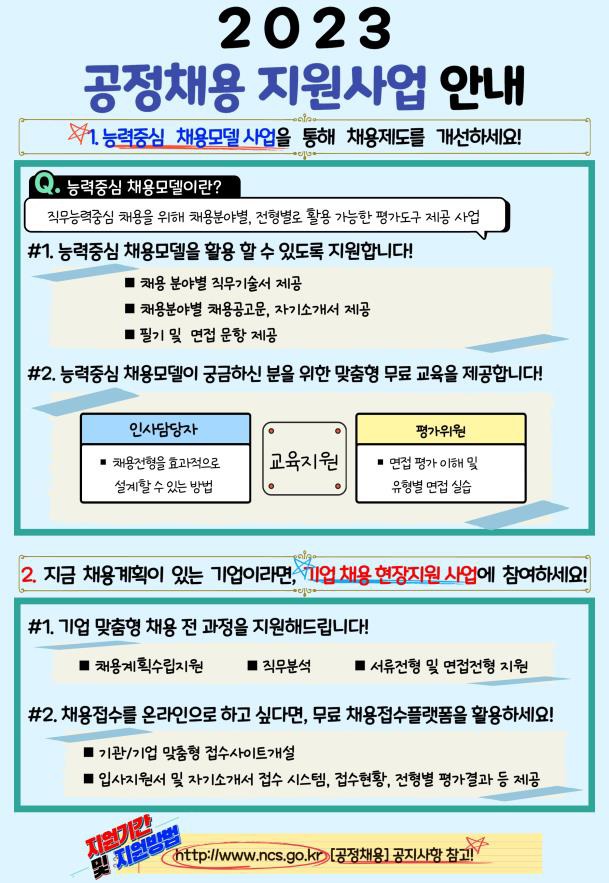 또한, 고용노동부와 공단은 하반기 채용에 대비해 컨설팅 외에도 채용접수 홈페이지 제공, 기업 맞춤형 채용공고,면접문항 등 평가도구 개발, 인사담당자.면접위원 교육 및 전문 면접관 풀 운영, 공정채용 가이드북 제공 등 필요한 지원을 이어갈 예정이다.