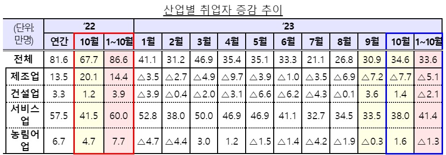 ④ 한편, 제조업 취업자수는 기저효과(’22.10월 +20.1만명) 등으로 감소하였으나, 도소매업은 53개월만에 증가 전환하였다. 청년 취업자수는 인구감소(‘23.10월 △17.6만명) 등으로 감소하였으나 감소폭은 축소되었다.