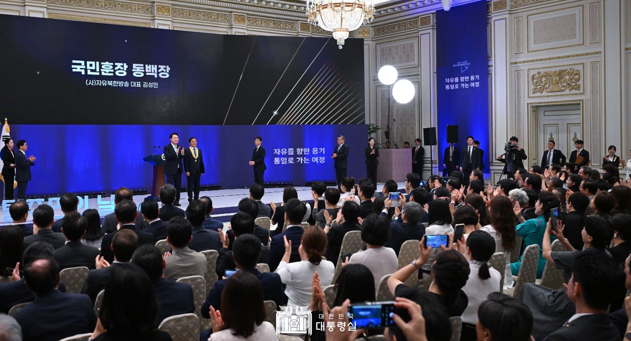 윤 대통령은 유공자 포상에서 북한이탈주민 지원에 기여한 공로를 인정해 김성민 자유북한방송대표(국민훈장 동백장), 임현수 글로벌연합 선교 훈련원 이사장(국민포장), 마순희 학마을 자조모임 대표(대통령 표창), 남북 주민으로 구성된 ‘위드봉사단’(대통령 표창)에게 훈·포장 및 표창을 직접 수여하고 격려했다.
