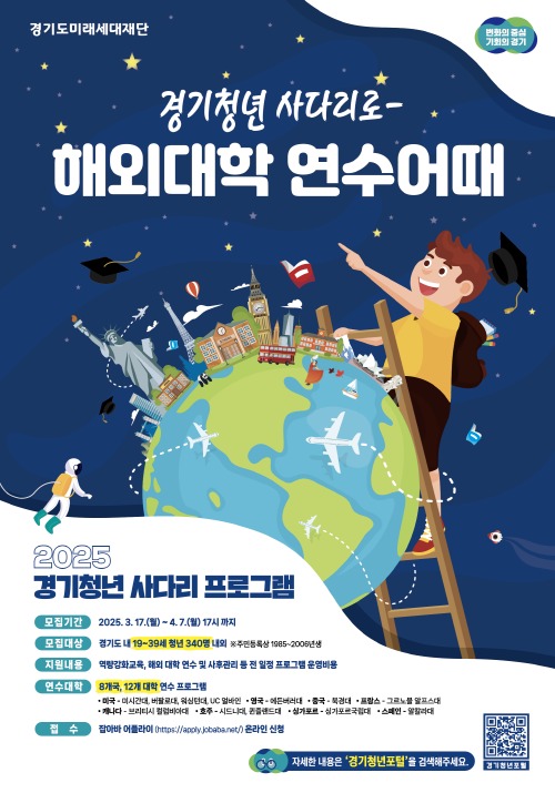 경기도와 경기도미래세대재단은 오는 4월 7일까지 미국 등 해외대학 연수 기회를 제공하는 ‘경기청년 사다리 프로그램’ 참여자 340명을 모집한다.