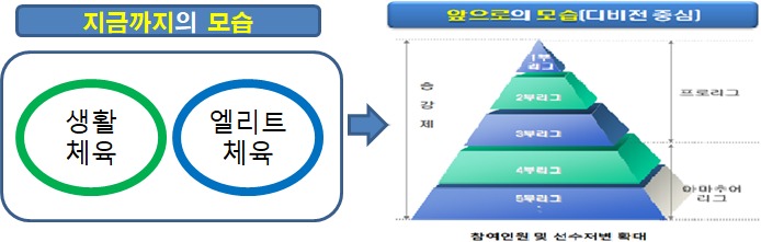 ‘승강제 리그’란 리그 운영 결과에 따라 하위 리그 상위팀과 상위 리그 하위팀을 맞바꾸는 체계를 말한다. 이 체계가 구축되면 경기력에 따라 상위 리그부터 하위 리그까지 리그별 수준이 자연스럽게 정착되면서 지역 동호회팀부터 프로・실업팀까지 하나의 체계로 운영이 가능하게 된다. 따라서 현재 생활체육, 전문체육으로 분리되어 운영되고 있는 체육대회를 승강제 리그로 통합해 연계 운영하면 생활체육 저변을 확대하고 우수한 인적 자원을 확충할 수 있다.