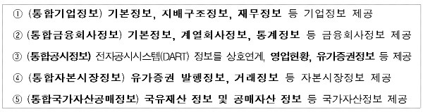 공개되는 정보는 통합기업, 통합금융회사, 통합공시, 통합자본시장, 통합국가자산공매 등 5개 핵심 분야의 50개 서비스, 5500개 항목, 4450만건으로 공공데이터포털(www.data.go.kr)을 통해 제공된다.
