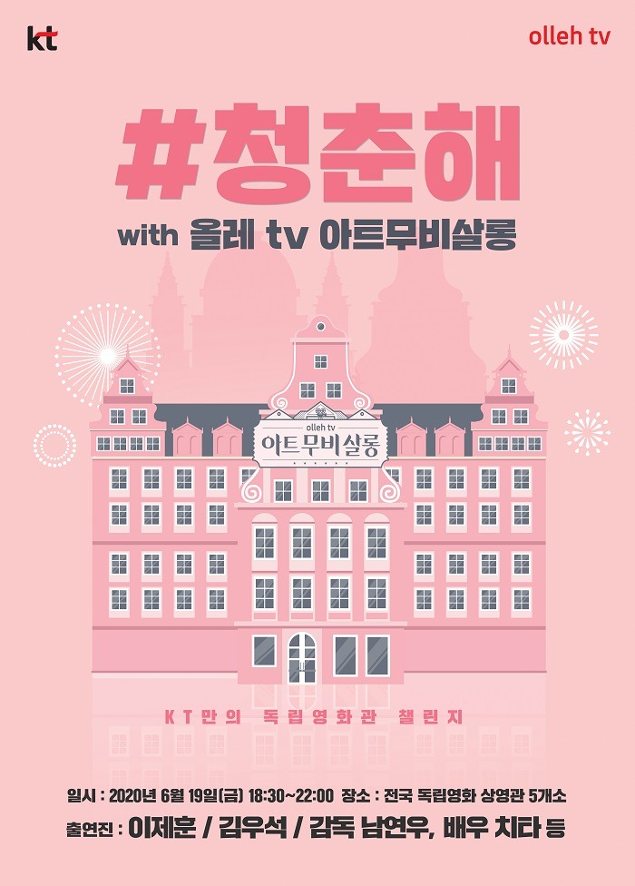 KT는 코로나19 장기화로 문화예술을 접할 기회가 줄어 답답한 청춘들과 힘든 시기를 겪고 있는 독립영화관 및 지역 뮤지션들을 응원하기 위해 ‘KT만의 독립영화관 챌린지, #청춘해’를 기획했다. 이번 청춘해는 총 3부로 구성된다. 1부와 2부는 배우와의 만남인 ‘올레 tv 아트무비살롱’, 3부는 뮤지션의 토크콘서트로, 5개 지역 독립영화관에 마련된 스크린으로 실시간 중계된다. 이번 행사는 생활 방역 지침에 따라 영화관마다 좌석 간 거리두기를 준수하며 진행할 방침이다.