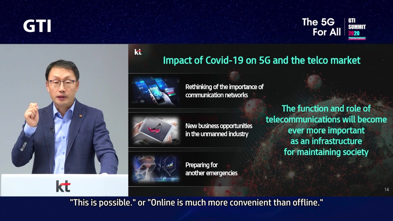 아울러, 현 시점에서 코로나19가 불러온 5G를 비롯한 통신시장의 기회를 잘 살펴야 한다고 강조했다. 코로나19로 인해 사회 유지 인프라로서 통신 네트워크의 중요성이 강조되고 있으며, 미디어·데이터 소비가 급증하는 등 통신 서비스에 대한 니즈가 커지고 있어 통신사의 역할이 새롭게 부각되고 있다고 설명했다.