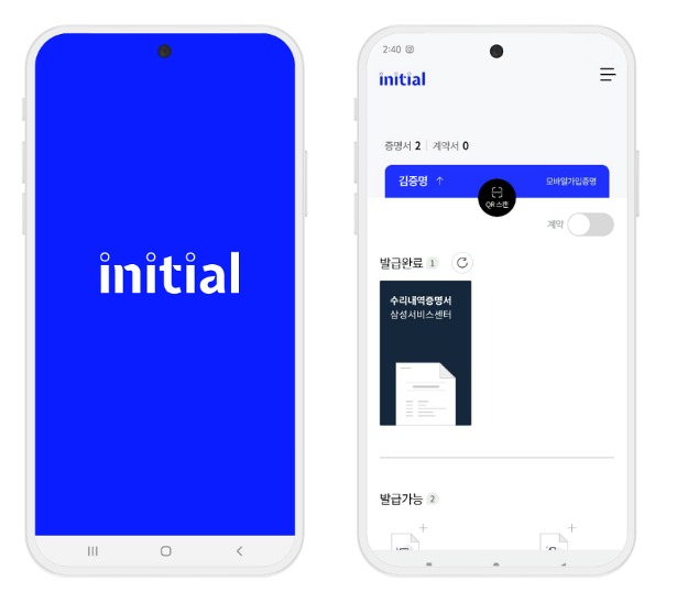 ‘이니셜 휴대폰보험 보상서비스’를 이용하는 고객은 휴대폰 서비스센터로부터 수리내역서와 영수증을 전자 증명서 형태로 이니셜 앱(App.)을 통해 발급받게 되며, 이를 앱에서 바로 보험사로 전송해 보험 심사를 받게 된다. 발급/제출 된 전자 증명서는 이니셜 블록체인 기술을 통해 위∙변조 및 유출이 불가하도록 안전하게 관리된다.