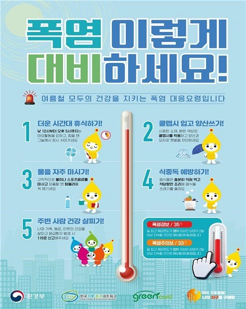 시민단체(한국기후·환경네트워크), 기업, 한국환경산업기술원이 전국 53개 시군구의 취약가구(기초생활수급자, 홀몸어르신 등) 2000곳에 생수와 시원한 깔개, 토시, 수건, 부채 등의 폭염대응물품을 지원하고, 폭염행동요령을 안내한다.