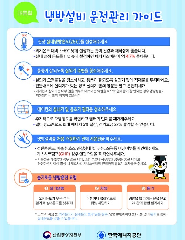 산업부는 국민들이 효율적으로 에어컨을 사용할 수 있도록 ‘냉방설비 운전관리 가이드’를 새롭게 마련해 캠페인 기간 동안 집중 홍보할 예정이다.