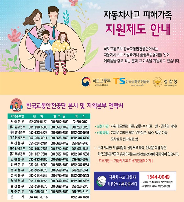 이와 함께 국토부는 자동차 사고로 사망하거나 중증 후유장애를 입은 저소득 가정에 재활비·생계비 지급 등 경제적 지원과 함께 심리안정지원 프로그램 등 정서적 지원도 하고 있다.