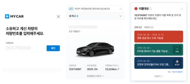 자동차 소유자가 ‘네이버 MY CAR’ 서비스에서 개인정보 제공 동의 및 내 차의 차량번호를 등록하면 내 차의 결함 및 시정조치(리콜) 여부 등을 확인할 수 있으며, 해당 리콜정보를 선택하면 ‘자동차리콜센터(www.car.go.kr)’ 홈페이지와 연계되어 보다 더 자세한 정보를 확인할 수 있다.