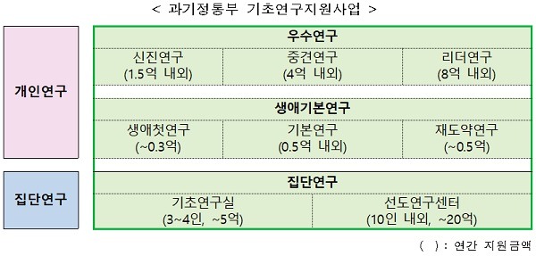 정부는 내년에 개인연구 1조 4770억 원, 집단연구 3137억 원 등 올해 대비 2909억 원 증액된 1조 7907억원 규모를 기초연구에 지원한다.