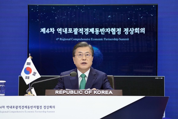 문 대통령은 이날 화상으로 열린 RCEP 정상회의 의제발언을 통해 “코로나의 도전과 보호무역 확산, 다자체제의 위기 앞에서 젊고 역동적인 아세안이 중심이 되어 세계 최대 규모의 자유무역협정을 체결하게 됐다. 우리는 자유무역의 가치 수호를 행동으로 옮겼다”며 이같이 말했다고 강민석 청와대 대변인이 브리핑을 통해 전했다.